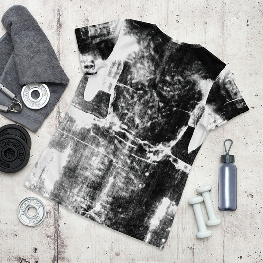 Deeper neckline, shorter sleeves, and a lighter and more athletic material
