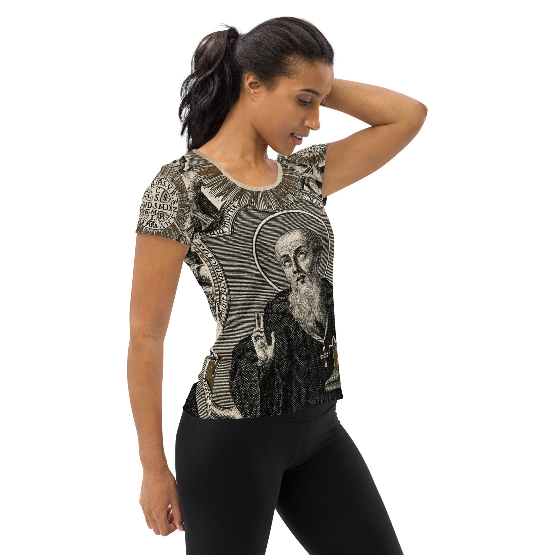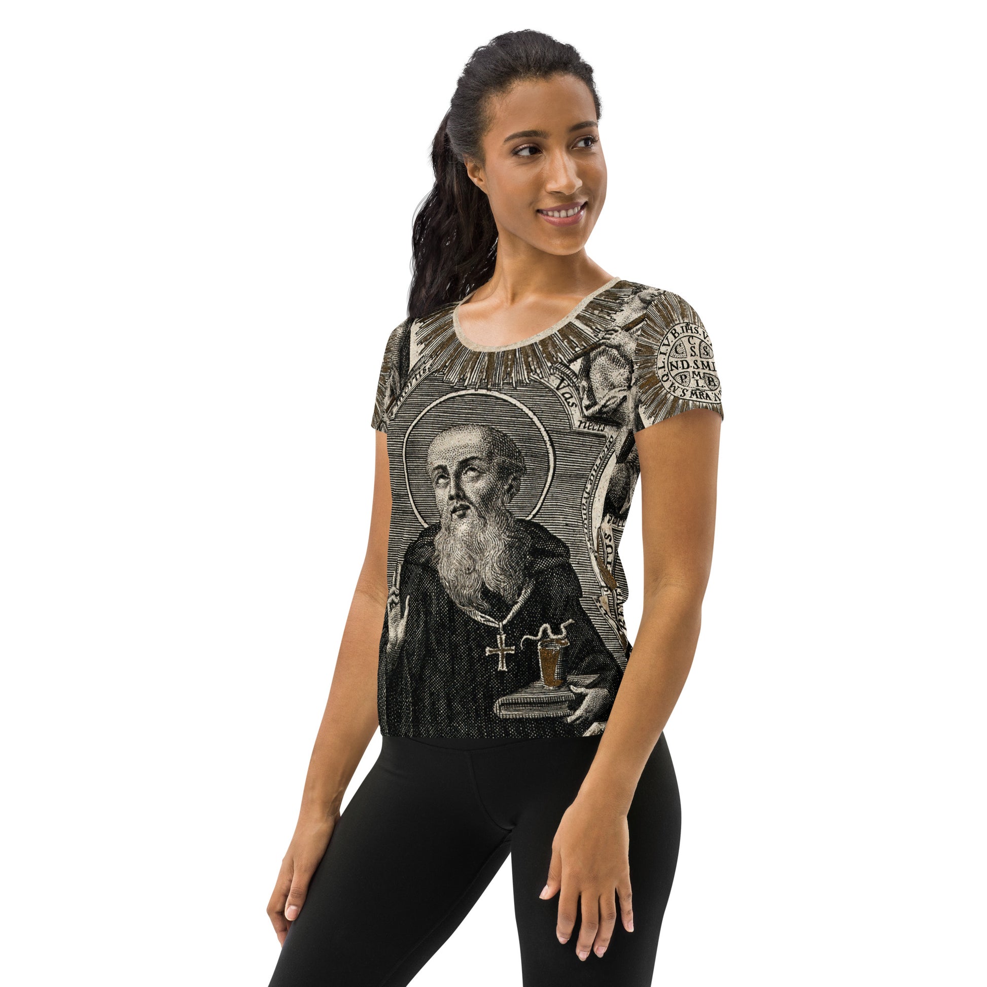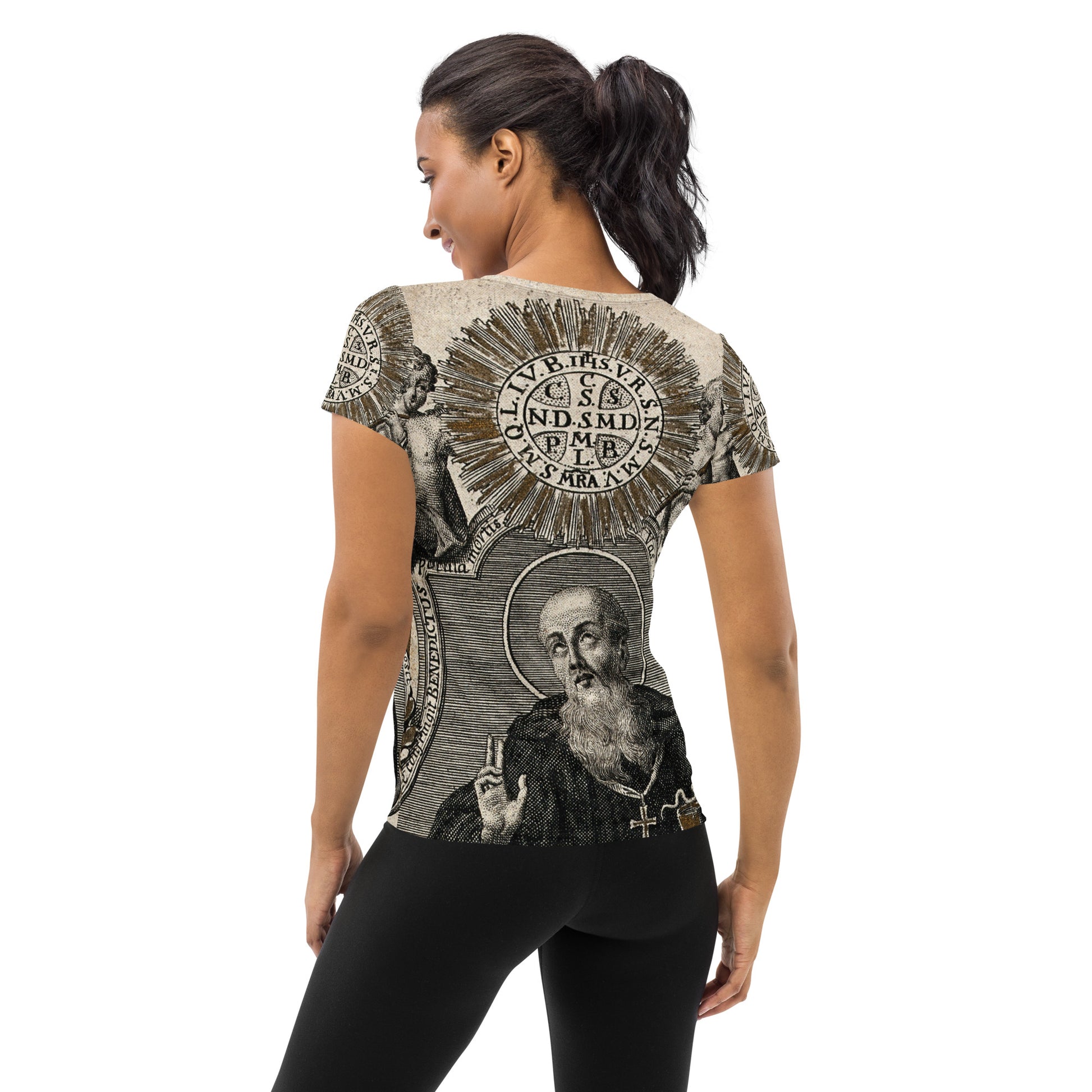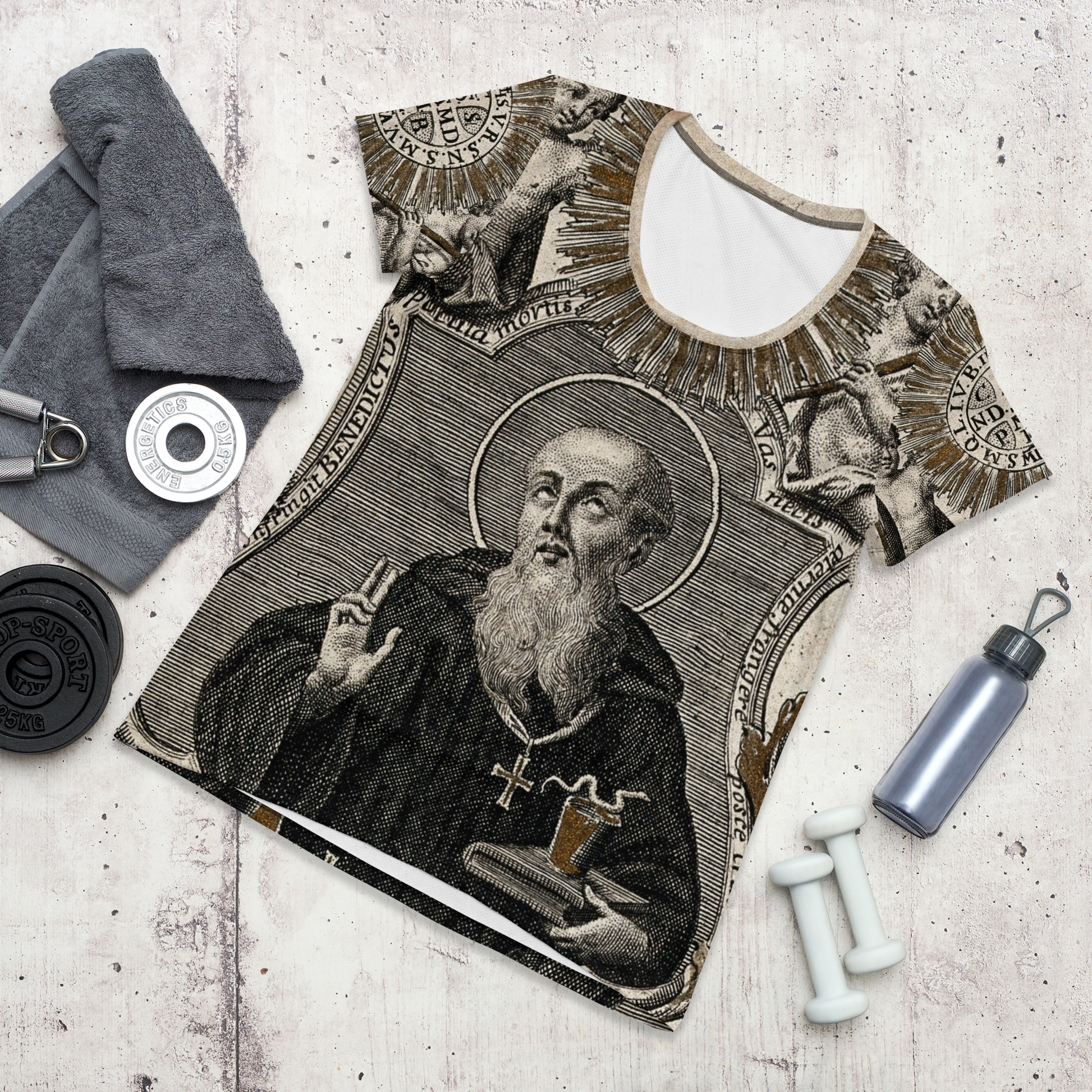 St. Benedict of Nursia invented Western monasticism around 500 AD. He was a hermit living alone, but became so holy he kept attracting followers, so he set up monasteries and instituted the first monastic “rule of life” to govern them. Demons hate St. Benedict so much that the circular emblems seen on the sleeves and back of this shirt are often pressed into medals and worn for protection.