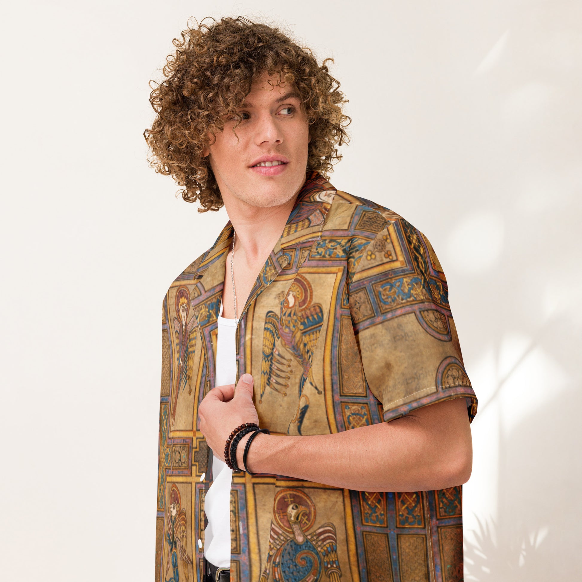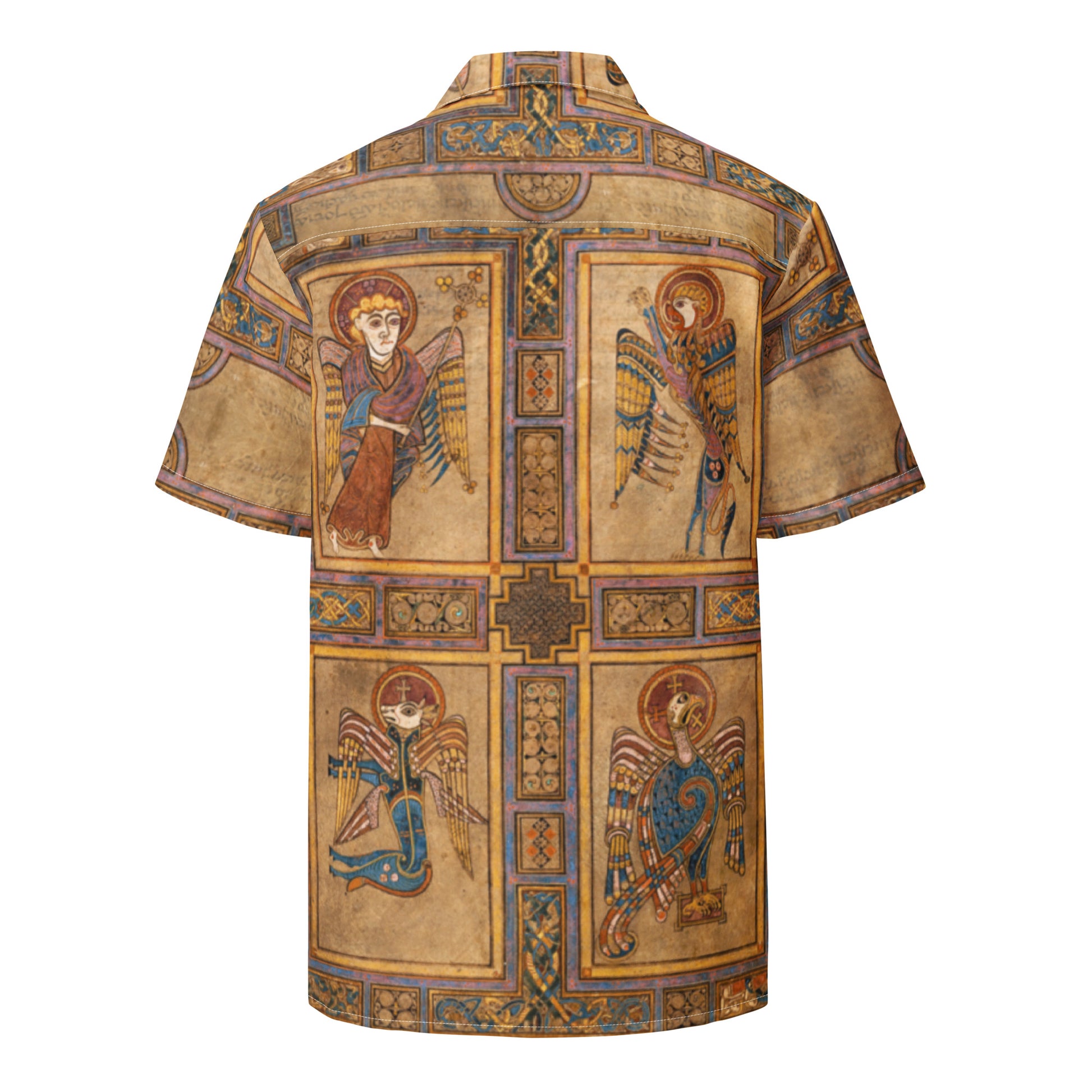 The Book of Kells is an illuminated manuscript of the Gospel accounts of the New Testament. This shirt features the 4 authors of the 4 Gospel accounts: Matthew depicted as a man, Mark as a lion, Luke as a calf or an ox, and John as an eagle.