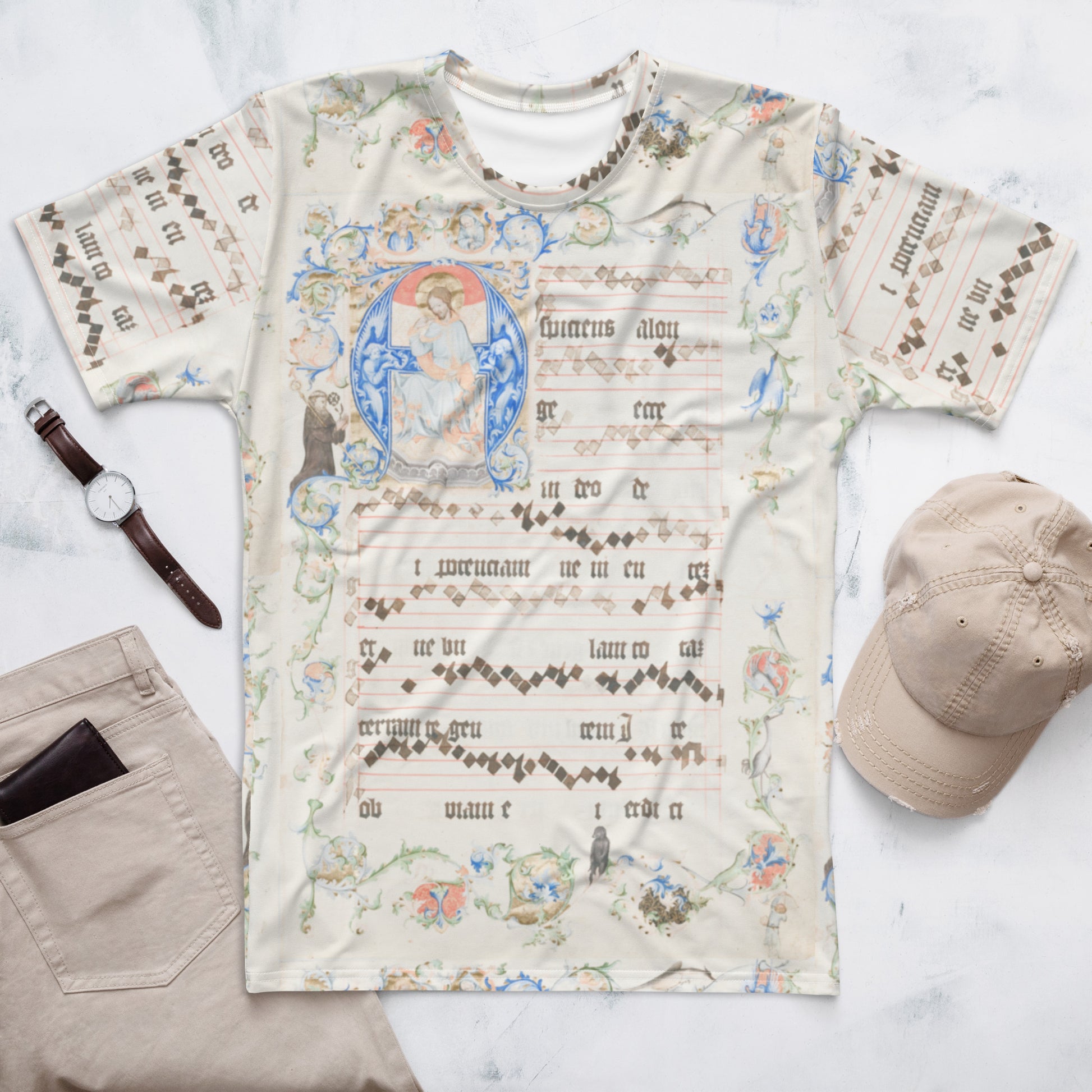 This shirt is a page in a 15th-century illuminated songbook ("antiphony"), showing Jesus reigning in heaven inside a decorated letter "A".